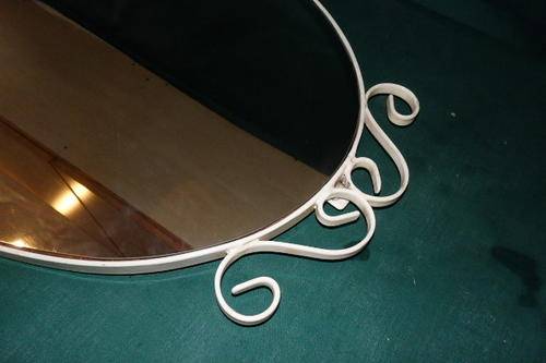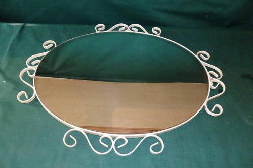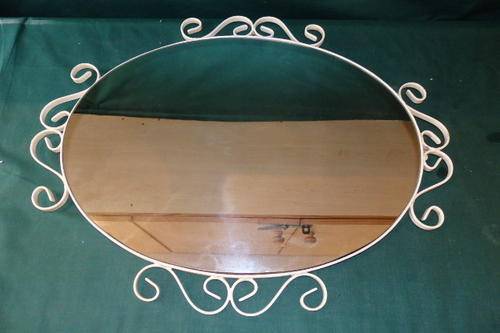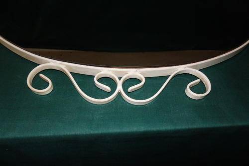 THIS FANTASTIC LARGE OVAL MIRROR IN A WHITE METAL FRAME WITH "TWIRLED" DESIGN VECTORS AROUND THE FRAME MEASURES A VERY DECENT 69cm x 53.5cm. THE MIRROR CAN BE HUNG LENGTHWAYS OR BREADTHWAYS.