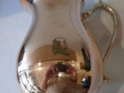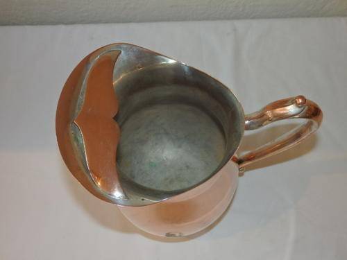 THIS BEAUTIFUL LARGE VINTAGE OUDE MEESTER BRANDY COPPER WATER JUG WITH AN ICE LIP AND A STUNNING "DESIGNED" HANDLE MEASURES 28.5cm TALL. THE JUG USED TO BE SILVER PLATED WHICH HAS WORN AWAY, EXPOSING THE STUNNING COPPER BASE. HERE IS STILL MINOR EVIDENCE OF THE SILVER PLATE WHICH MAKES IT QUITE UNUSUAL.