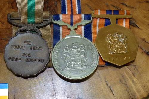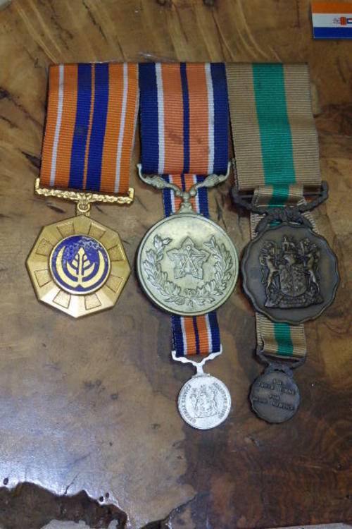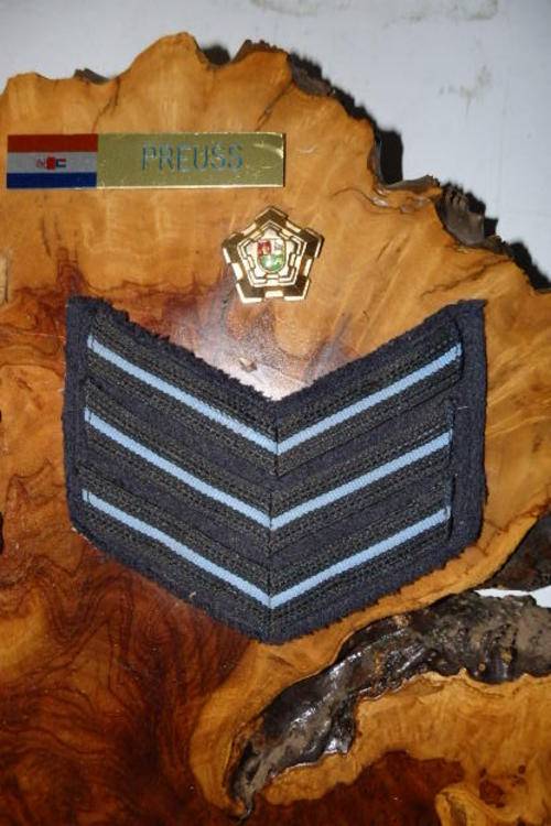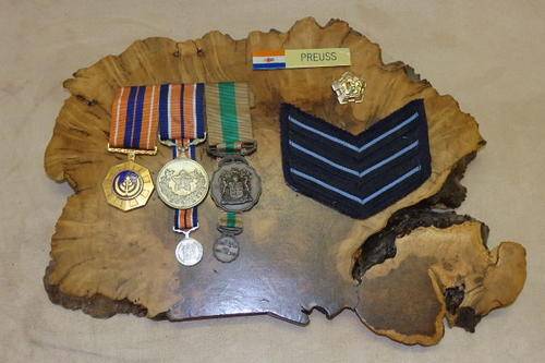 THIS FANTASTIC SADF (PRE 1994) MEDAL BOARD FOR (SOUTH AFRICAN AIR FORCE) FLIGHT SERGEANT ML PREUSS HAS A PROPATRIA MEDAL, A GENERAL SERVICE MEDAL AND MINIATURE AS WELL AS A GOOD SERVICE MEDAL AND MINIATURE WITH HIS RANK AND NAME BADGE AND MEASURES ROUGHLY 34cm ACROSS x 24cm AND IS IN EXCELLENT CONDITION. THERE IS ALSO A PERSONNEL FILE WITH PHOTOGRAPHS, SOME OFFICIAL STAMPED AND DATED LETTERS, THE CERTIFICATE REGARDING THE AWARDING OF THE PROPATRIA MEDAL AND A FEW OTHER BITS AND PIECES. THIS IS A WONDERFUL COLLECTORS PIECE. (I WILL BE LOADING HIS AIR FORCE UNIFORM NEXT)