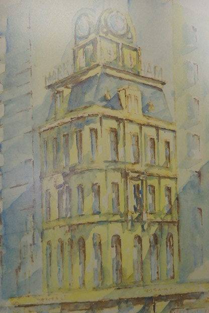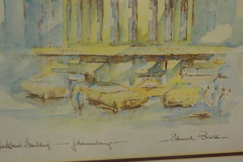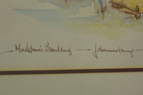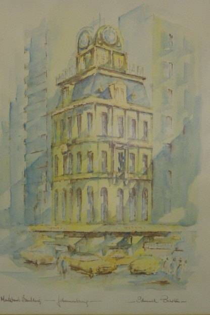 THIS AWESOME ORIGINAL WATERCOLOUR PAINTING OF "MARKHAM'S BUILDING - JOHANNESBURG" BY INTERNATIONAL ARTIST EDMUND BARTON (LIVING IN SOUTH AFRICA) IS PART OF HIS HISTORICAL SOUTH AFRICAN BUILDING COLLECTION WHICH I BELIEVE WAS A SPECIFICALLY COMMISSION. THE PAINTING IS FRAMED BEHIND NON-REFLECTIVE GLASS IN A SOLID WOODEN FRAME. THE PAINTING IS IN BEAUTIFUL CONDITION AND MEASURES 570mm WIDE x 675mm HIGH. HIS APPLICATION OF COLOURS AND ATTENTION TO DETAILING MAKES THIS ENTIRE COLLECTION A MASTER PIECE. THE PAINTING IS SIGNED AND THE TITLE INSCRIBED ON THE PAINTING. YOU ARE WELCOME TO VIEW THE COLLECTION AT OUR EDENVALE BRANCH.