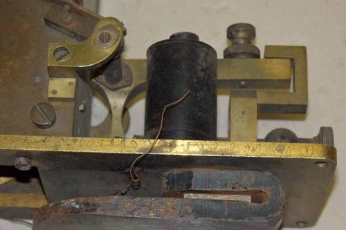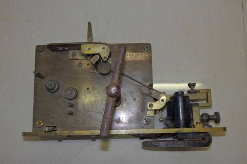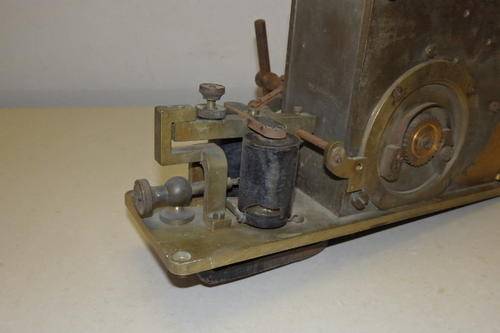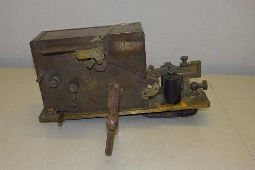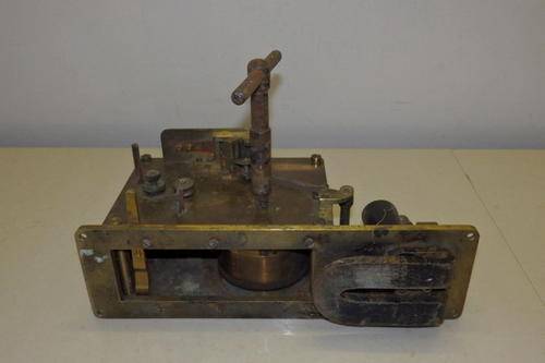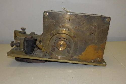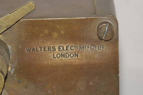 THIS FANTASTIC AND INCREDIBLY RARE VERY HEAVY SOLID BRASS ANTIQUE (c1900) "WALTERS ELECTRICAL MANUFACTURERS LTD" OF LONDON 500 OHM ELECTRICAL TELEGRAPH TAPPER WEIGHS IN AT A HEFTY 6.040kg AND MEASURES 28.5cm LONG x 20cm WIDE (INCLUDING THE WIND-UP KEY) x 15cm TALL. THE UNIT WAS APPARENTLY MOUNTED TO A SURFACE (MOSTLY AT POSTAL SERVICES) WHERE IT WAS USED TO COMMUNICATE OVER LONG DISTANCES. WALTERS ELECTRICAL MANUFACTURERS LTD LATER WENT ON TO SUPPLY THE BRITISH TELEPHONE COMPANY WITH TELEPHONE UNITS. VERY LITTLE IS RECORDED ABOUT THIS SPECIFIC UNIT.