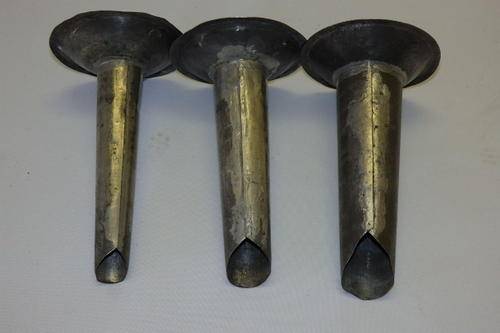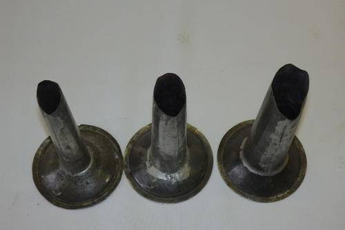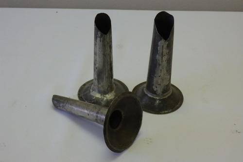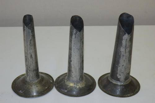 THIS FANTASTIC SET OF THREE DIFFERENT SIZE VINTAGE SAUSAGE (BOEREWORS) STUFFERS FOR SAUSAGE CASINGS WERE ATTACHED TO EITHER A MINCING MACHINE OR A SAUSAGE MAKER. THE METAL STUFFERS ARE ROUGHLY ABOUT 15cm LONG AND 9cm ACROSS THE BASE. SOMETHING DIFFERENT FOR A FARM-STYLE KITCHEN.