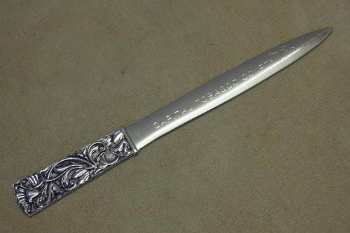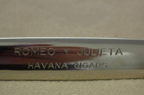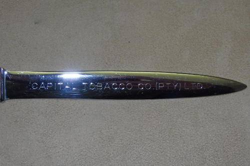 THIS FANTASTIC SILVER PLATED "CAPITAL TOBACCO COMPANY (PTY) LTD" ROMEO Y JULIETA HAVANA CIGARS LETTER OPENER MEASURES 18cm LONG. THE BEAUTIFUL HANDLE HAKES THIS LETTER OPENER QUITE AN ATTRACTIVE PIECE. THERE IS MINOR USAGE RELATED WEAR AND TEAR.