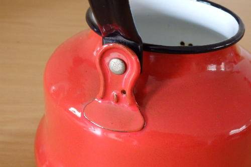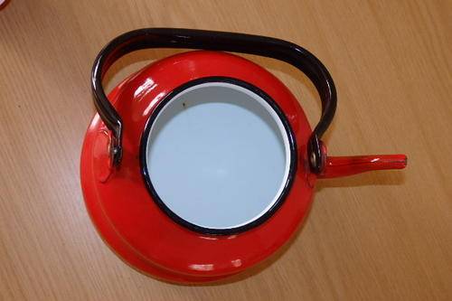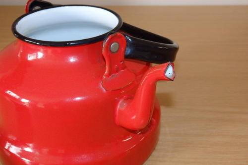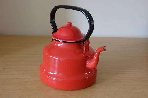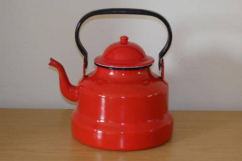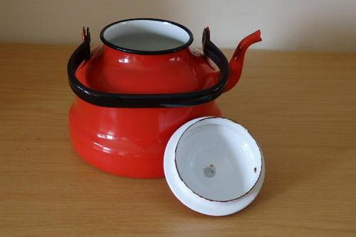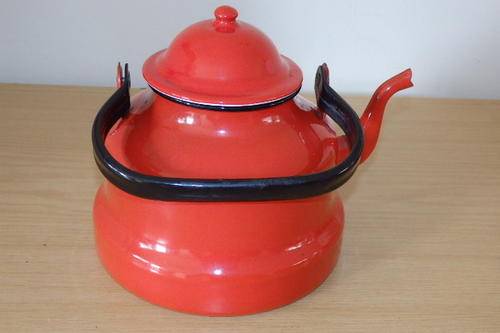 THIS FANTASTIC VINTAGE BLACK AND BRIGHT RED ELAMELWARE STOVETOP KETTLE MEASURES 22cm LONG (SPOUT TO END) x 21.5cm HIGH INCLUDING THE HANDLE. THE KETTLE IS A WHITE ENAMEL ON THE INSIDE. THERE IS A LITTLE AGE AND USAGE RELATED WEAR AND TEAR, BUT IT ADDS TO THE APPEAL OF THIS WONDERFUL OLD KETTLE.