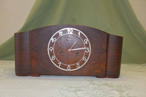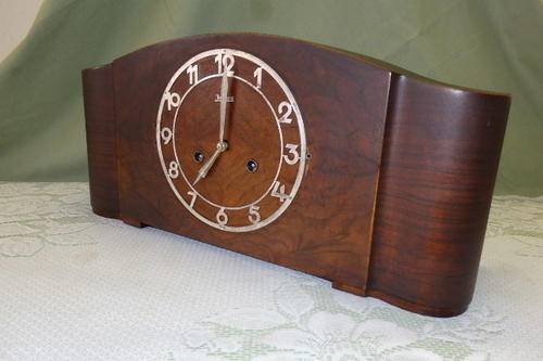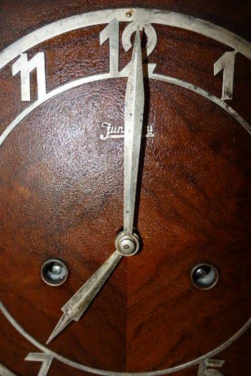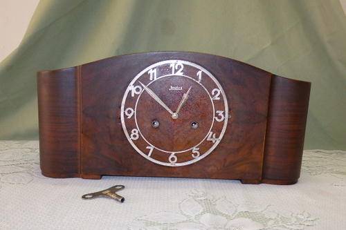 THIS FANTASTIC VINTAGE GERMAN MADE JUNGHANS CHIMING MANTLE CLOCK WITH ITS ORIGINAL WIND-UP KEY IS SUCH AN AMAZING FIND. THE MANTLE CLOCK MEASURES 45.7cm LONG x 13.2cm WIDE x 21.6cm TALL. THE CLOCK IS IN WORKING ORDER AND CHIMES ON THE HALF HOUR AND HOUR, AND ALSO HAS AN ON/OFF LEVER ON THE BACK OF THE CLOCK. THE GLASS DOOR ON THE FRONT IS MISSING, BUT I THINK A CLOCK MAKER COULD REPLACE IT (STRANGELY ENOUGH, IT LOOKS GREAT WITHOUT IT). THE CASE IS IN WONDERFUL CONDITION WITH MINOR AGE AND USAGE RELATED WEAR AND TEAR.