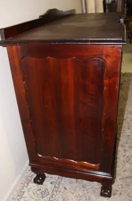 This fabulous vintage Imbuia ball & claw buffet/ side server with stunning craftsmanship, two cupboards and three drawers is in great condition.There are three large drawers with ornate handles in the centre and two side cupboards with a shelf for dinnerware. The buffet measures 157cm long x 67cm deep x 103cm high. The buffet cabinet is in lovely condition and has normal age and usage related wear, as shown in the pics there is a mark on the one side on the top. Please view the pics carefully to fully appreciate this stunning quality buffet and to confirm the condition. Please view the shipping options or request courier costs prior to purchasing any of our products.