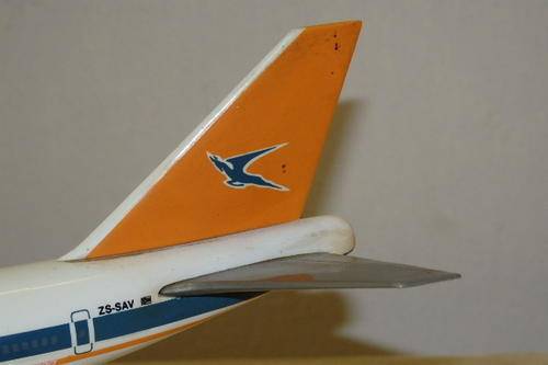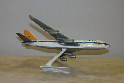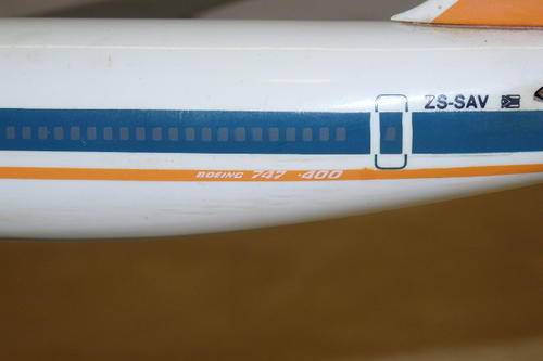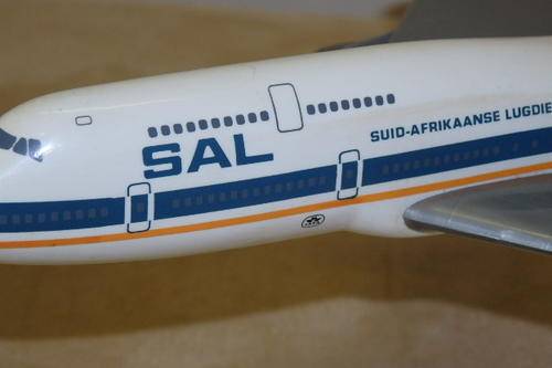 THIS FANTASTIC VINTAGE "SAA/ SAL" BOEING 747 - 400 "DOUBLE DECKER" ZS-SAV AEROPLANE MODEL ON A STAND MEASURES 27.5cm LONG x 26cm WIDE (WINGSPAN) x 13cm HIGH. THE AEROPLANE IS IN GREAT CONDITION AND STILL HAS THE OLD SOUTH AFRICAN TAIL FIN EMBLEM (PRE 1994).