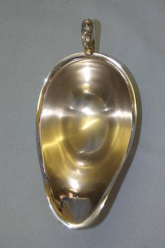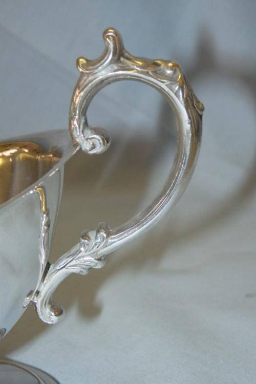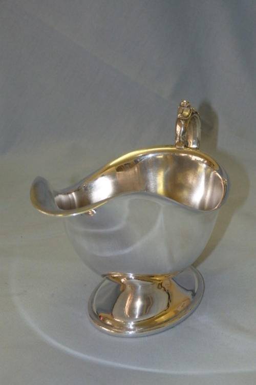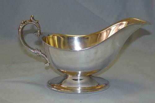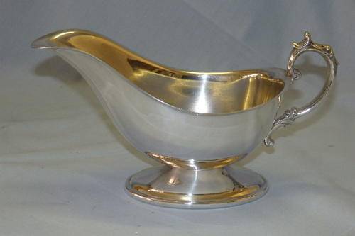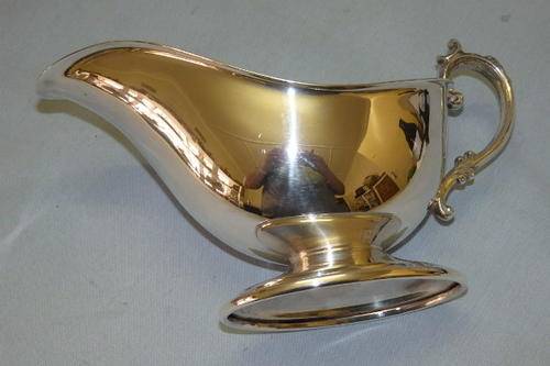 A FANTASTIC VINTAGE SILVER PLATED FOOTED GRAVY BOAT WITH AN AWESOME DETAILED HANDLE