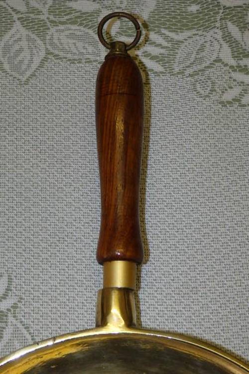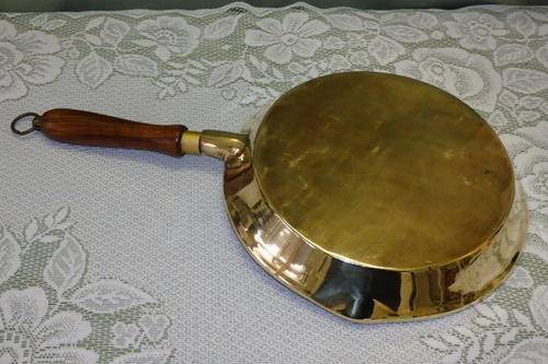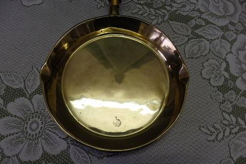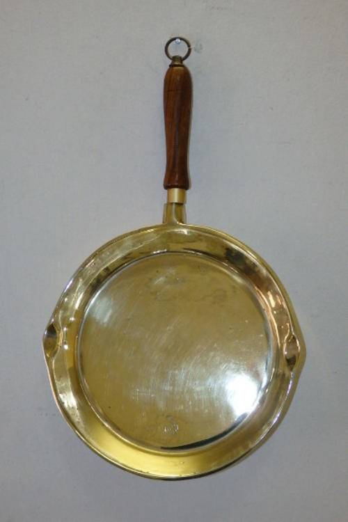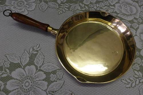 THIS FANTASTIC VINTAGE SOLID BRASS (HEAVY) FRYING PAN/ SKILLET WITH DOUBLE POURERS AND A WOODEN HANDLE (WITH HANGER) MEASURES A VERY DECENT 45cm LONG INCLUDING THE HANDLE x 25cm ACROSS x 4cm DEEP. THE SKILLET IS IN FANTASTIC CONDITION WITH MINIMAL AGE AND USAGE RELATED WEAR AND TEAR AND SCUFFS ETC. THIS IS A TRULY FANTASTIC FIND AND THE IDEAL SKILLET FOR A CHEF. IT WOULD ALSO MAKE A STUNNING WALL HANGER IN A VINTAGE STYLE KITCHEN.