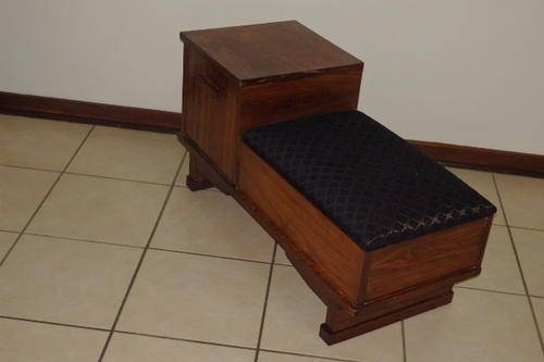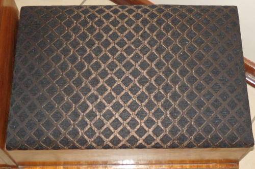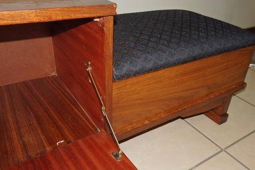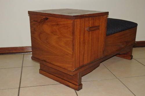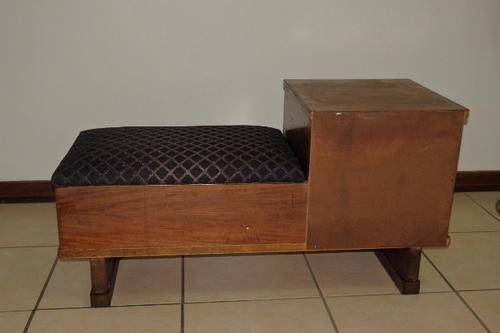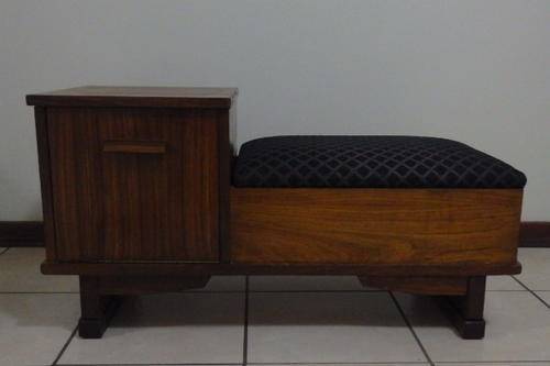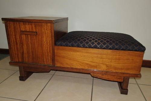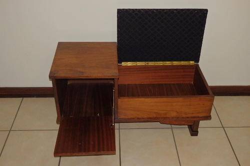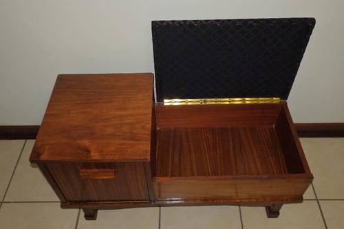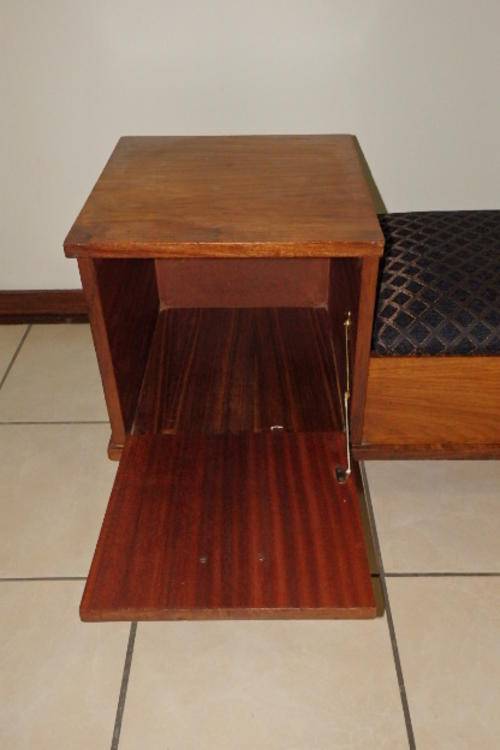 THIS FANTASTIC VINTAGE TELEPHONE TABLE HAS TWO STORAGE SECTIONS (A LITTLE SIDE CUPBOARD AND UNDER THE HINGED SEAT) AND A BEAUTIFULLY UPHOLSTERED BLACK AND COPPER FABRIC SEAT. THE TABLE IS A VERY SOLID AND HEAVY PIECE OF FURNITURE AND MADE TO LAST!!! THE TELEPHONE TABLE MEASURES 910mm LONG x 385mm WIDE AND 470mm HIGH. I THINK THE WOOD IS AN IMBUIA AND TEAK COMBINATION. THERE ARE A FEW SCUFFS, BUT THE TABLE IS IN VERY GOOD CONDITION FOR ITS AGE..
