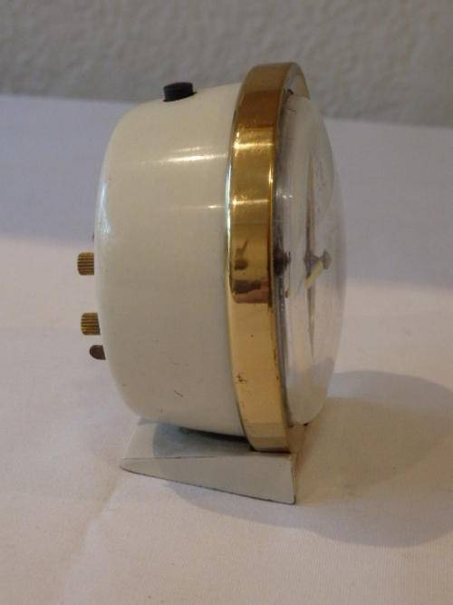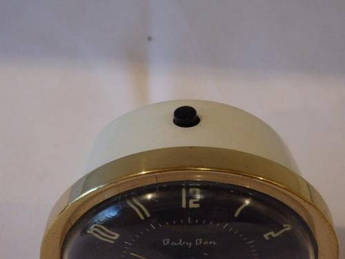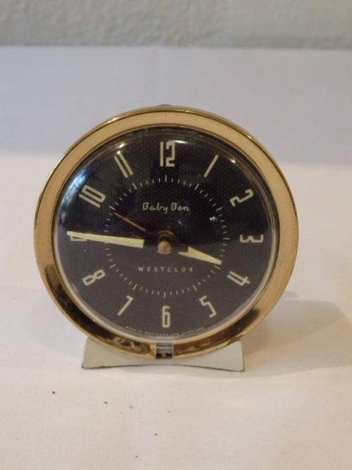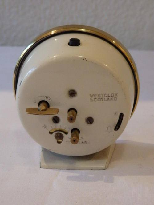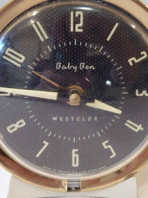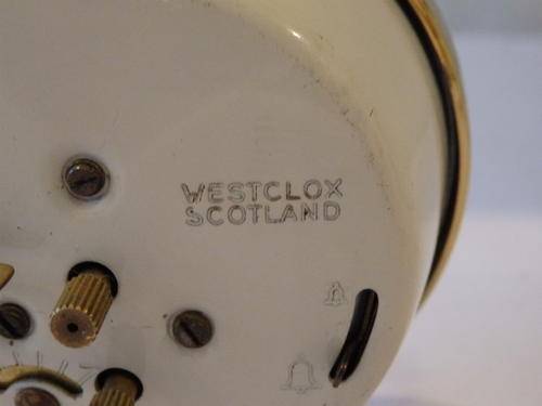 THIS FANTASTIC WHITE VINTAGE WESTCLOX OF SCOTLAND "BABY BEN" STYLE 8 BEDSIDE/ TRAVEL ALARM CLOCK WAS MADE BETWEEN 1964 AND 1981. THE CLOCK MEASURES 8.5cm x 9cm. THERE IS SOME AGE AND USAGE RELATED WEAR AND TEAR, BUT THIS AWESOME WIND UP CLOCK IS A BEAUTIFUL EXAMPLE OF VINTAGE CLOCKS. THE OUTER CASING AND STAND ARE METAL WITH A BRASS PLATED FACE CASING. THE CLOCK DOES NEED TO BE SERVICED TO GET IT INTO WORKING CONDITION.
