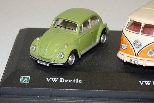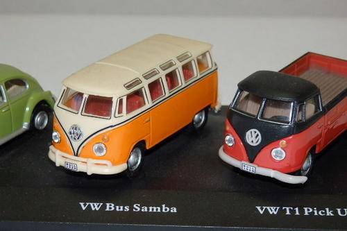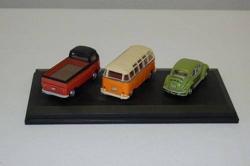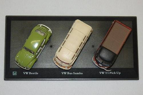 THIS FANTASTIC VOLKSWAGEN "TRIO" DIE CAST MINIATURE SET IS MOUNTED ON A BASE AND INCLUDES THE BEETLE, THE SAMBA BUS AND THE T1 PICK-UP. THE BASE MEASURES 16cm IN LENGTH x 8cm WIDE. THE CARS ARE IN GOOD GENERAL CONDITION. PLEASE VIEW THE PICS CAREFULLY.