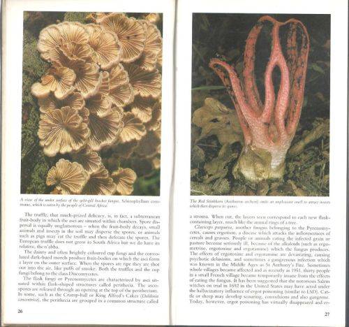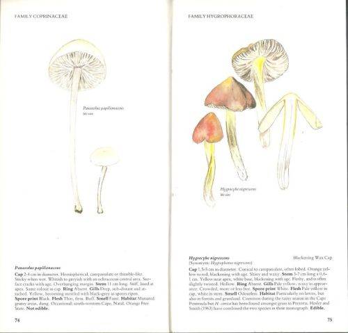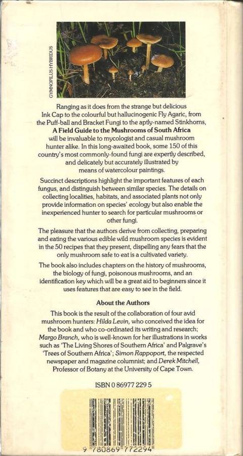 Ranging as it does from the strange but delicious Ink Cap to the colourful but hallucinogenic Fly Agaric, from the Puff-ball and Bracket Fungi to the aptly-named Stinkhorns, A Field Guide to the Mushrooms of South Africa has proved invaluable to mycologist and casual mushroom hunter alike. In this edition, more than 150 of southern Africa's most commonly-found fungi are expertly described, and delicately but accurately illustrated by means of water colour paintings and photographs. Succinct descriptions highlight the important features of each fungus, and distinguish between similar species. The details on collecting localities, habitats, and associated plants not only provide information on species' ecology but also enable the inexperienced hunter to search for particular mushrooms or other fungi. Hardcover with picture boards. Hilda Levin, Simon Rappoport, Derek Mitchel, illustrations by Margo Branch. First edition published by Struik, 1985. 168 pages with Index. Reference List. Glossary. Recipes. Chapters on history of mycology, special descriptions, collecting, mushrooms in the kitchen etc. Good condition. Registered postage is R45.00.