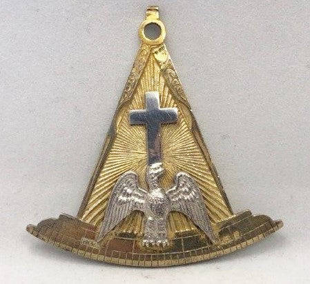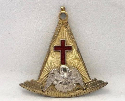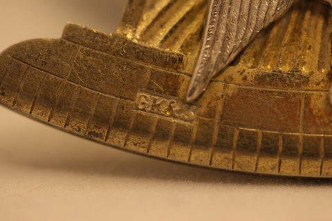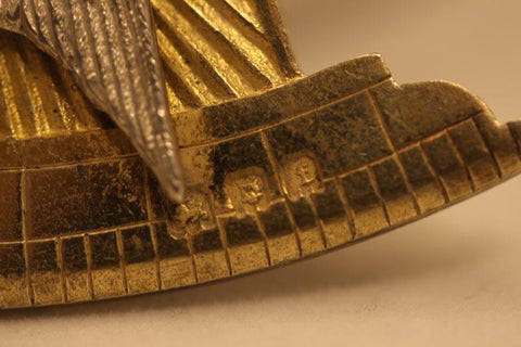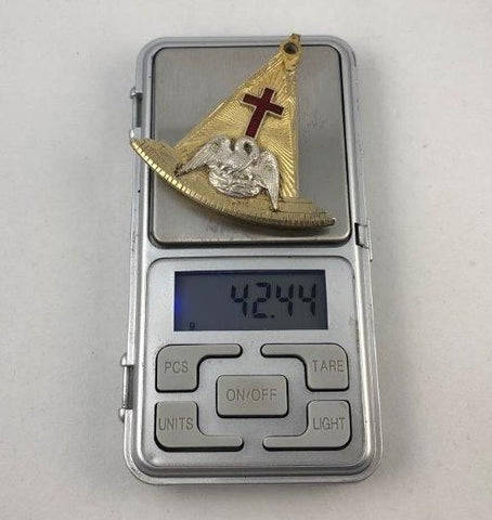 This gold plated Sterling silver Freemason emblem weighs 42.44 grams and is in total 5.5cm long. The hallmarks consist of the makers mark"GK&S" confirming it is a George Kenning & sons piece, the Lion Passant confirming it is British sterling silver, the Leopard Assay mark confirming it was made in London and the date letter "f" confirming it was made in 1921.