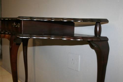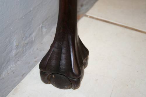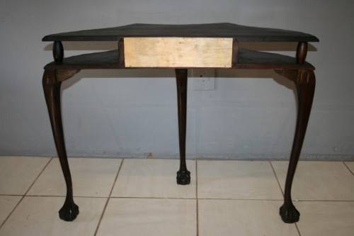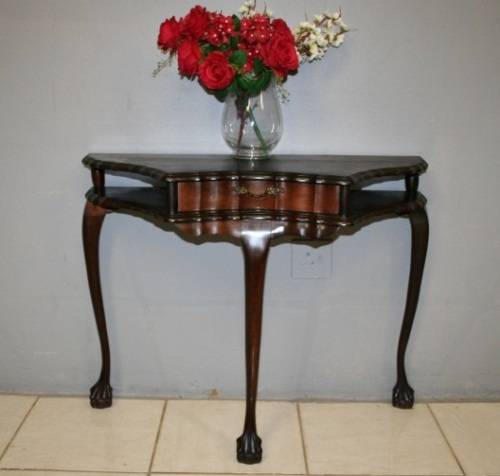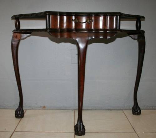 THIS BEAUTIFUL AND VERY ELEGANT VINTAGE SOLID IMBUIA BALL AND CLAW "HALF MOON" TABLE WITH LOVELY DETAILING ALL AROUND THE FRONT AND SIDE OF THE TABLE IS PERFECT FOR AN ENTRANCE HALL OR ANY LIVING ROOM . THE TABLE IS THE PERFECT DISPLAY TABLE FOR A FEATURE PIECE OR LAMP ETC. THE TABLE MEASURES APPROXIMATELY 1000mm LONG x 510mm WIDE x 710mm HIGH. THE TABLE IS DEFINITELY A EYE CATCHER. PLEASE VIEW THE PICS CAREFULLY TO FULLY APPRECIATE THIS GORGEOUS TABLE AND TO CONFIRM THE CONDITION.