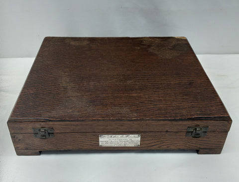 This wonderful vintage 12-setting double-clasp English oak veneer cutlery canteen/ caddy/ box with a traditional green felt lining is the ideal cutlery canteen for your vintage or antique cutlery service set. The canteen measures 33cm long x 29cm wide x 8cm high and is in good antique condition. The canteen has a silver plated plaque on the front which confirms the age of the canteen (Presented to: Arthur L Shepstone by the Directors of Service Office Supplies (Pty) Ltd on the occasion of his marriage 27-10-51. The cutlery canteen will keep your silver plated cutlery cleaner for longer and avoid unnecessary scratches. There is age and usage related wear and tear as shown in the pictures. Please view the pics carefully to confirm the condition of this lovely antique 12-setting oak canteen.