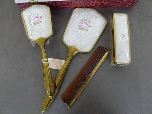 THIS FABULOUS SET LOOKS AS THOUGH IT HAS BEEN IN THE BOX AND NEVER BEEN OUT, LET ALONE USED. EXTREMELY RARE TO FIND THIS PARTICULAR MAKE WITH NO FOXING / DISCOLOURATION ON THE LACE. THE DESIGN IS RICH BRIGHT GOLD COLOUR OF THE HANDLES AND RIMS WHICH SURROUND BEAUTIFUL BRIGHT WHITE LACE WITH A PINK CABBAGE ROSE ON PORCELAIN CABOUCHON TO THE CENTER OF THE BRUSHES AND MIRROR. THIS SET STILL HAS THE PLASTIC COVERING ON TO PROTECT THE LACE. OVERALL, A SUPERB SET WHICH I THINK YOU WOULD HAVE GREAT DIFFICULTY FINDING WITH IT'S BEAUTIFUL GIFT BOX.THESE WERE GIVEN AT 'COMING OF AGE' BIRTHDAYS, ENGAGEMENT AND BRIDAL GIFTS TO BRIDES TO BE.
