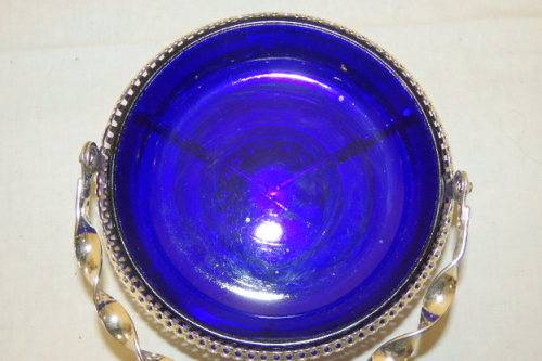 THIS GORGEOUS ENGLISH MADE SILVER PLATED FOOTED CONDIMENT STAND WITH A "COBALT" BLUE GLASS BOWLS IS IN FANTASTIC CONDITION AND HAS ABSOLUTE MINIMAL AGE AND USAGE RELATED WEAR AND TEAR. THE STAND IS 15cm ACROSS AND 16cm HIGH WHEN THE HANDLE IS UP. THE GLASS BOWL HAS ABSOLUTELY NO CHIPS OR CRACKS IN IT.