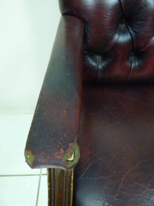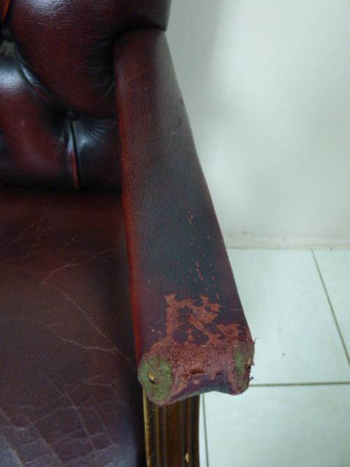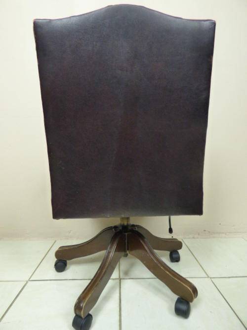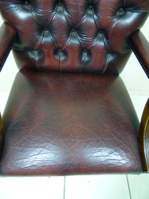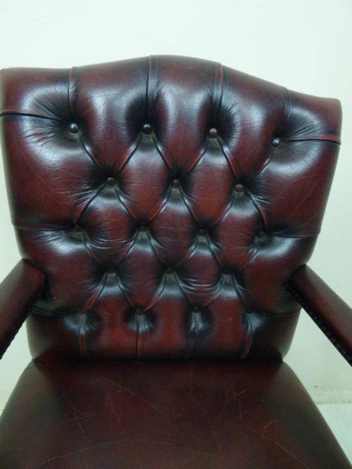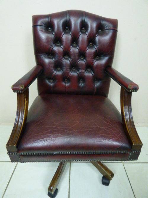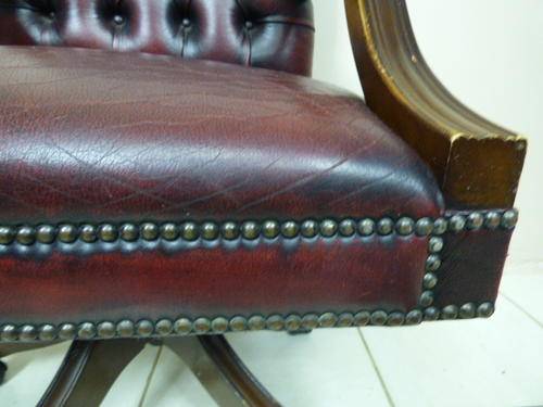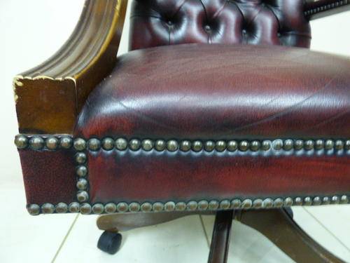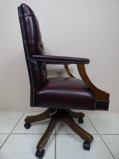 WE ARE OFFERING A STUNNING GENUINE LEATHER 'CHESTERFIELD STYLE' EXECUTIVE CHAIR IN GREAT CONDITION FOR THE AGE ALTHOUGH THE ARMRESTS ARE WORN (PLEASE SEE PICS)! THE CHAIR LEGS ARE ON CASTORS FOR EASY MOVEMENT, THE CHAIR STILL HAS THE ORIGINAL RICH & LUXURIOUS DARK MAROON LEATHER AND FINISHED OFF WITH BEAUTIFUL CHESTERFIELD STYLE STUDS AND DETAILING!!! THE ARMRESTS HAVE A BIT OF DAMAGE TO THE LEATHER BUT COULD EASILY BE FIXED. THE SIZE OF THIS STUNNING CHAIR IS APPROXIMATELY 52cm x 60cm x 101cm HIGH.