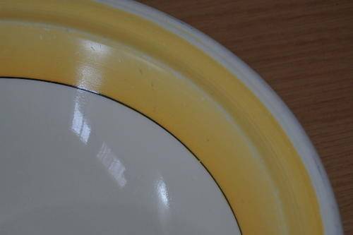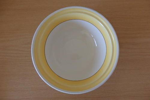 THIS GORGEOUS GRINDLEY OF ENGLAND PORCELAIN SERVING BOWL WITH A BROAD YELLOW RIM AND THINK BLACK LINE MEASURES 21.5cm ACROSS x 7.5cm HIGH. THE BOWL HAS THE GREEN GRINDLEY BACKSTAMP DATING IT TO AROUND 1954. THERE ARE NO CHIPS OR CRACKS IN THE BOWL AND THERE IS MINOR AGE AND USAGE RELATED WEAR AND TEAR.