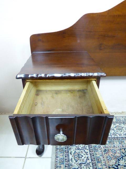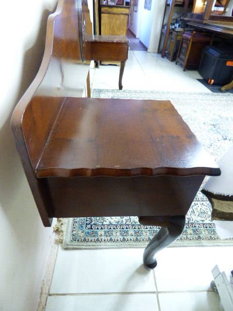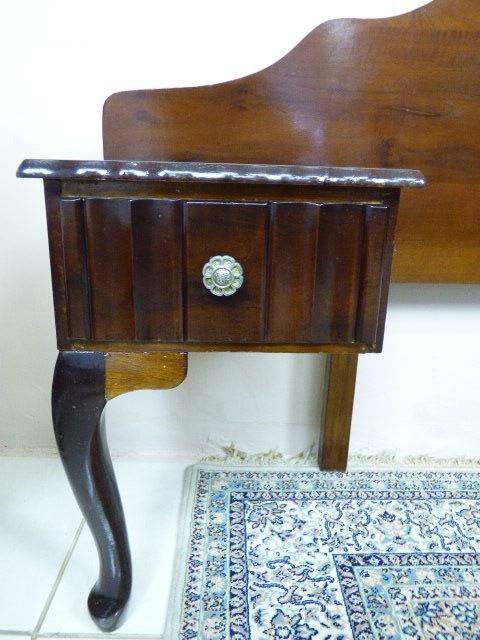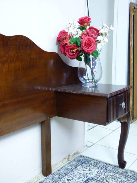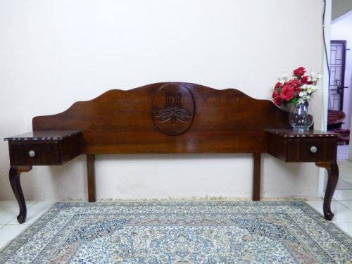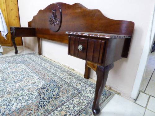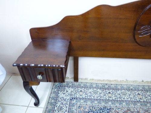 THIS GORGEOUS IMBUIA QUEEN ANNE STYLE HEADBOARD WITH TWO SIDE PEDESTALS MEASURES 214cm LONG, 40cm WIDE AND 96cm HIGH. THE SPACE BETWEEN THE PEDESTALS FOR YOUR MATTRESS MEASURES 144cm. THE DAINTY HANDLES ON THE DRAWS ARE BEAUTIFUL. THE WOODWORK AND DETAIL ON THIS HEADBOARD IS OUTSTANDING! THIS IS A BEAUTIFUL, CLASSY AND STYLISH PIECE OF FURNITURE!!! THERE IS HARDLY ANY WEAR ON THIS HEADBOARD, IT IS A STUNNING PIECE OF FURNITURE.