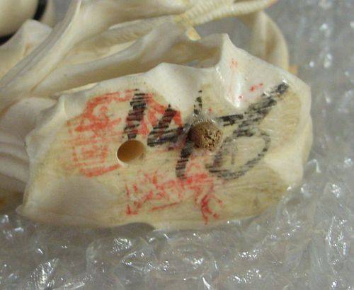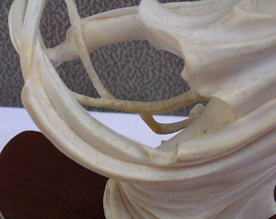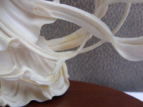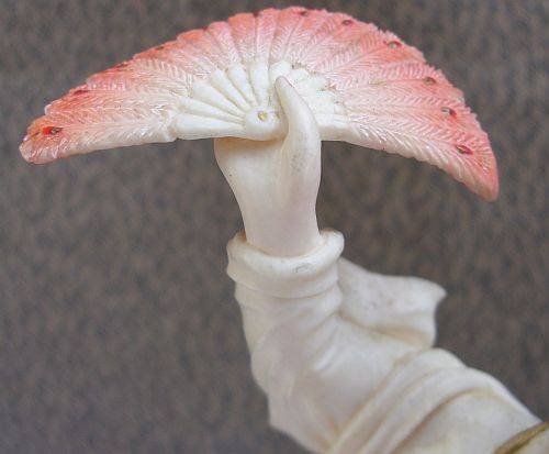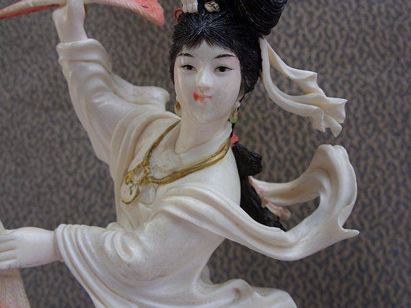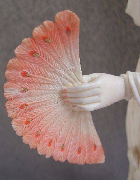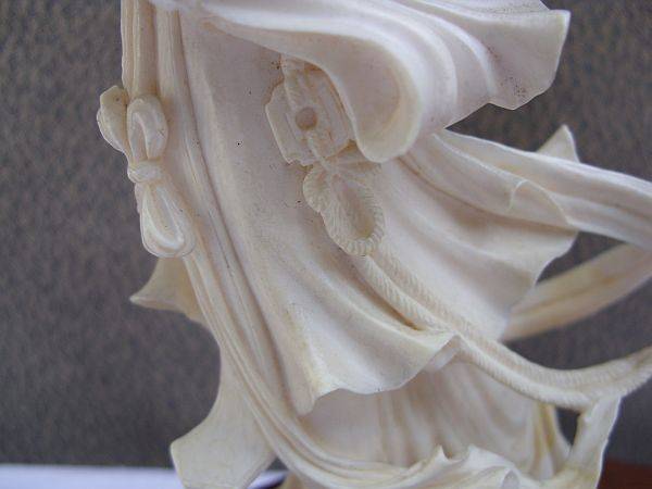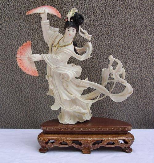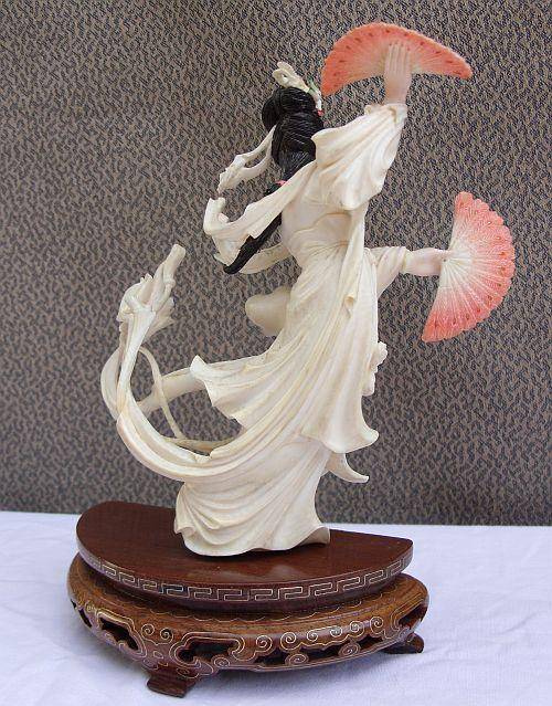 This is a solid ivory statue carved from one piece . The base is stamped and numbered . In one pic from the back you will notice an extremely small repair to the part of the dress that flares upward . This is not visible from the front unless detecting with a magnifying glass .