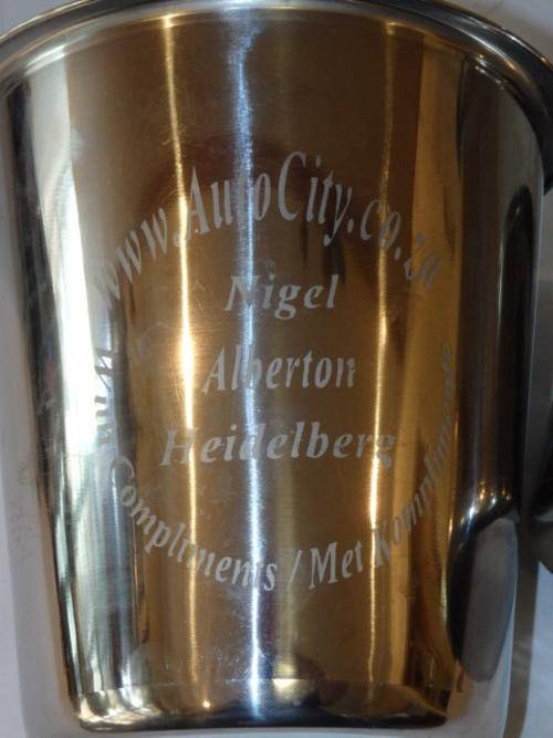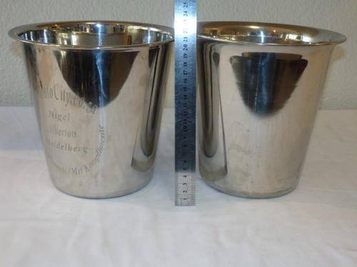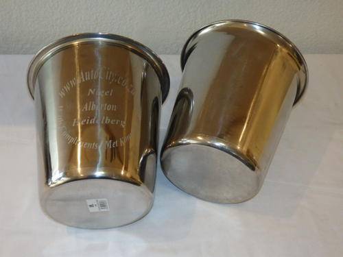 THIS IS A BEAUTIFUL SET OF TWO LARGE POLISHED STAINLESS STEEL ICE BUCKETS. THE ONE BUCKET HAS THE INSCRIPTION "WWW.AUTOCITY.CO.ZA WITH COMPLIMENTS NIGEL, ALBERTON, HEIDELBERG" ON IT AND THE OTHER ON IS CLEAN POLISHED. STUNNING BUCKETS TO KEEP THAT WINE CHILLED! THEY MEASURE 21cm TALL EACH.