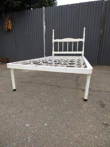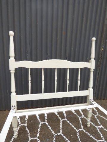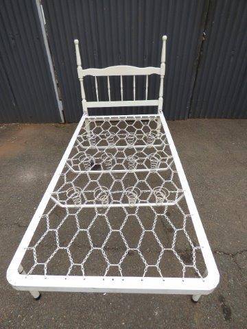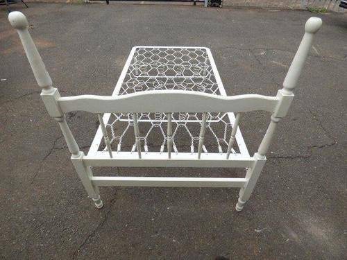 A GORGEOUS SINGLE BED, THIS BED WILL LOOK STUNNING IN A LITTLE GIRL'S ROOM OR IN A GUEST ROOM. THESE KIND OF BEDS ALSO MAKE STUNNING SOFAS ON YOUR PORCH OR PATIO, JUST ADD A MATTRESS, LARGE CUSHIONS AND STAND IT AGAINST A WALL. THE BED IS STURDY AND HAS A FEW BITS WHERE THE PAINT HAS CHIPPED. THIS LOVELY BED MEASURES APPROXIMATELY 93cm x 195cm x 111cm HIGH. BEAUTIFUL.