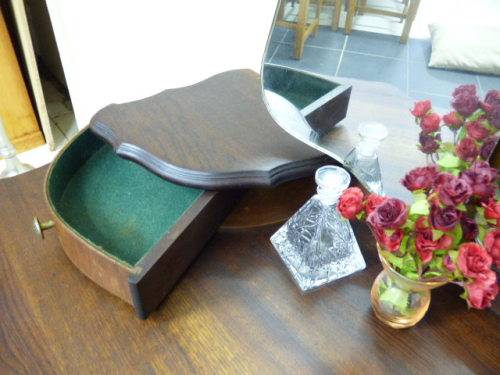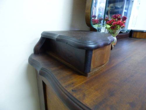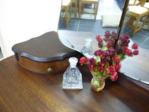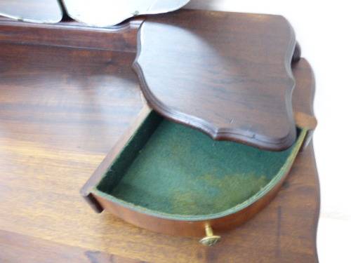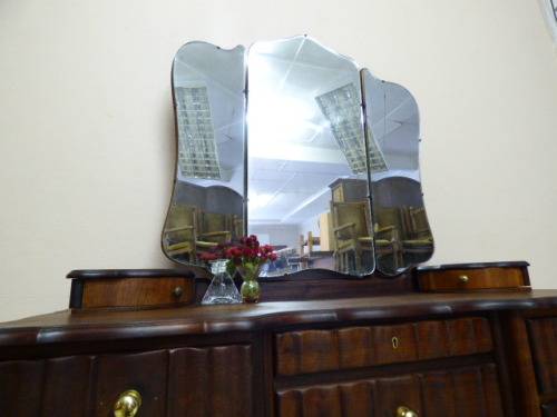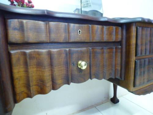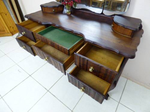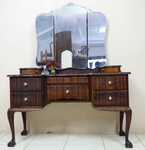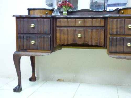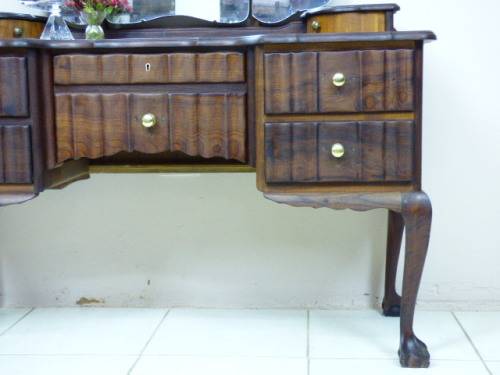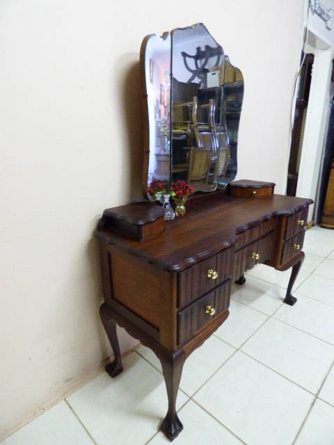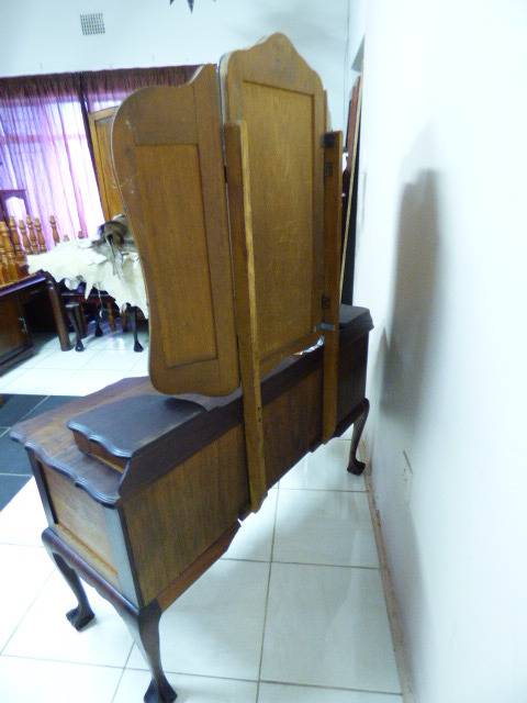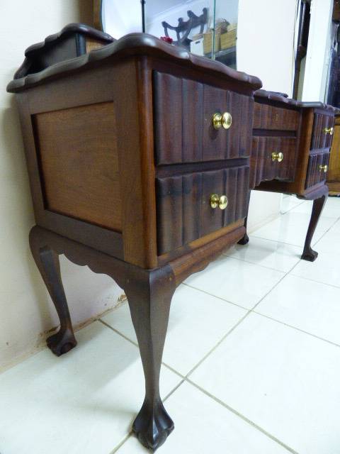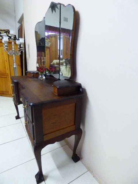 THIS GORGEOUS IMBUIA BALL AND CLAW DRESSING TABLE MEASURES 129cm LONG, 50cm WIDE AND 165cm HIGH. IT HAS A LARGE CENTRE MIRROR AND TWO SIDE MIRRORS. THE DAINTY HANDLES ON THE DRAWS ARE BEAUTIFUL. THE WOODWORK AND DETAIL ON THIS DRESSING TABLE IS OUTSTANDING! THIS IS A BEAUTIFUL, CLASSY AND STYLISH PIECE OF FURNITURE!!! THERE IS HARDLY ANY WEAR ON THIS DRESSING TABLE, IT IS A STUNNING PIECE OF FURNITURE. PLEASE NOTE THERE IS NO KEY FOR THE TOP DRAWER.