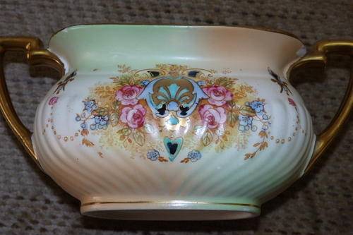 THIS BEAUTIFUL VINTAGE (c1940's) GEORGIAN ERA ART DECO CROWN DEVON OF STOKE-ON-TRENT, ENGLAND "GREEN BLUSH" SERIES "WICK" PATTERN MILK JUG AND OPEN SUGAR BOWL SET MEASURE AS FOLLOWS: THE MILK JUG IS 12cm (SPOUT TO HANDLE) x 7.5cm AND 7cm TALL, AND THE SUGAR BOWL IS 17.5cm LONG (HANDLE TO HANDLE) x 9cm x 8cm TALL. THE INCREDIBLE DETAILING OF THE PATTERN HAS BEEN FINISHED WITH "OBVIOUS" GOLD GILDING ON THE HANDLES AND BEAUTIFUL GILD ACCENTUATING DETAILING THROUGHOUT THE PATTERN. THERE IS SOME WEAR AND TEAR AND FADING OF THE GILDING WHICH IS TO BE EXPECTED IN VINTAGE PIECES. THERE IS A CHIP (NO CRACKS) UNDER THE RIM OF THE SUGAR BOWL (I BELIEVE IT CAN BE REPAIRED) BUT THERE ARE NO VISIBLE CHIPS OR CRACKS IN THE MILK JUG. PLEASE NOTE THE "HOLES" IN THE RIM OF THE JUG ARE MANUFACTURER'S DETAILING AND NOT DAMAGE.