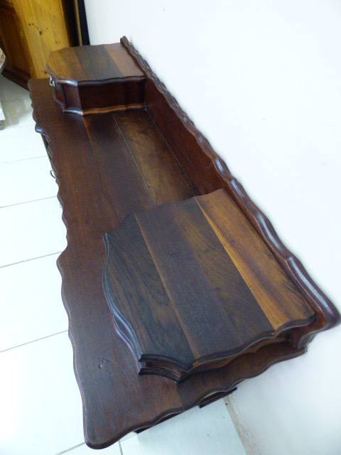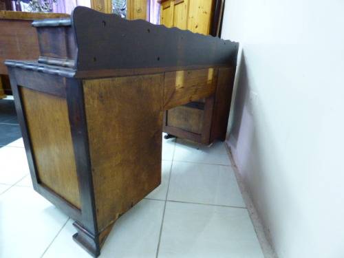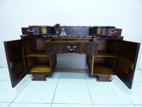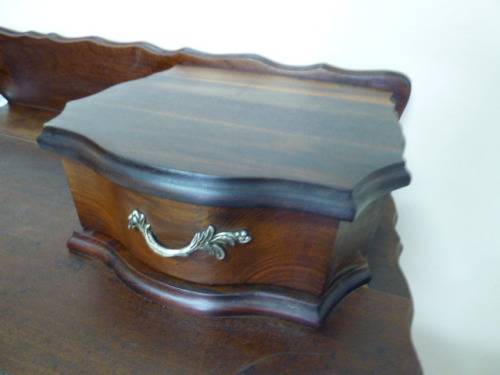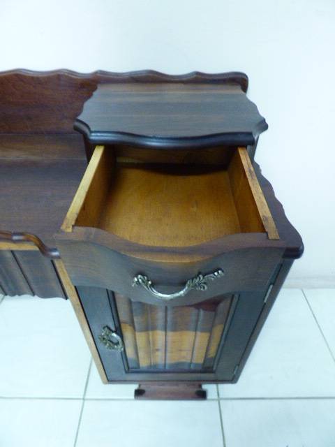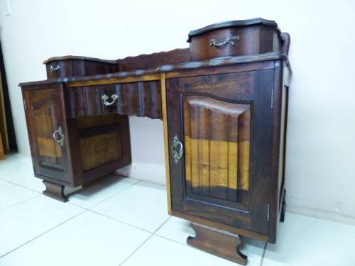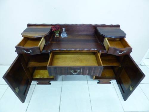 THIS GORGEOUS VINTAGE IMBUIA DRESSING TABLE MEASURES 145cm LONG, 45cm WIDE AND 79cm HIGH. IT HAS NO MIRROR ATTACHED BUT THAT LEAVES YOUR OPTIONS WIDE OPEN. ONE COULD USE THIS AS A DRESSER OR A SMALL DESK OR HAVE IT IN A HALLWAY, ADD A MIRROR TO YOUR WALL AND IT WILL LOOK FANTASTIC. THE DAINTY HANDLES ON THE DRAWS ARE BEAUTIFUL. THIS IS A BEAUTIFUL PIECE OF FURNITURE AND WITH THE THREE DRAWERS AND TWO CUPBOARDS THERE IS AMPLE PACKING SPACE.