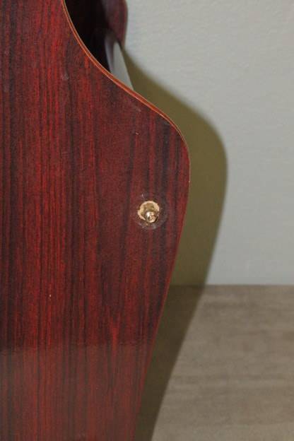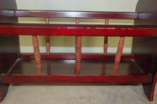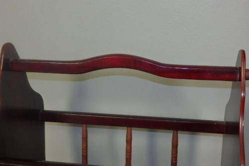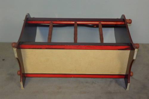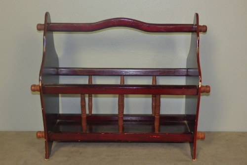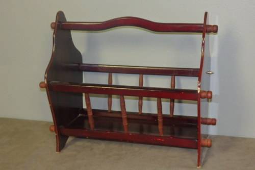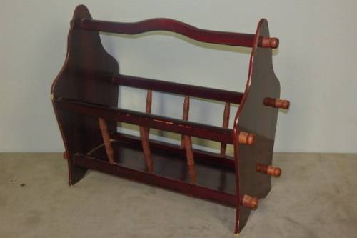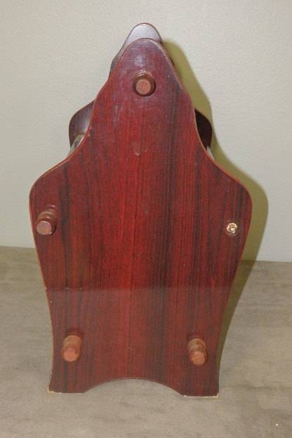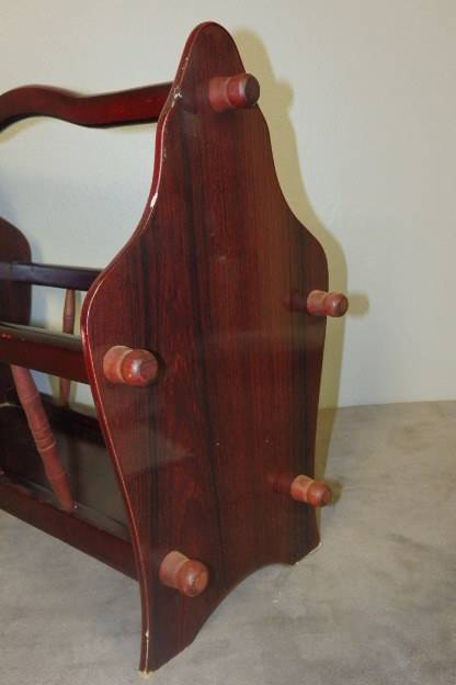 THIS WONDERFUL VINTAGE WOODEN MAGAZINE STAND HAS A CARRY HANDLE, SO IS PERFECT TO USE INDOORS AND OUTDOORS. THE MAGAZINE STAND IS LONG ENOUGH TO HOLD MANY OF THE INTERNATIONAL MAGAZINES AND MEASURES 43cm LONG x 36cm HIGH x 21.5cm WIDE. THIS IS A VERY BEAUTIFULLY MADE MAGAZINE STAND THAT WOULD LOOK STUNNING IN JUST ABOUT ANY LIVING ROOM. THERE IS MINIMAL AGE AND USAGE RELATED WEAR AND TEAR AND SCUFFS. THE ONE FINIAL ON THE SIDE IS MISSING.