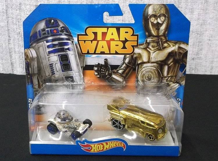 Here are two , more cool than funny looking vehicles modeled after the STAR WARS characters R2-D2 and C-3PO . Die cast metal , Hotwheels quality