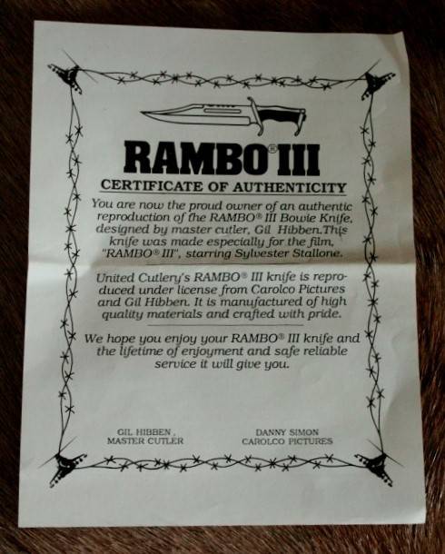 This superb original (United Cutlery GH201) 1988 Gil Hibben "Rambo III" Bowie/ survival knife is in its original box with the sheath and the certificate and is in awesome condition. This is the original knife released into the market in 1988 after the movie Rambo III was released and was designed by Gil Hibben with Sylvester Stallone. The knife is 16" (40.64cm) with an 11" (29.94cm) blade. The sheath is still in its original protective plastic cover. Please note that this is not the newer 2008-release knife, but the original 1988 released knife which is a far better and higher quality replica knife. Please view the pics carefully to fully appreciate this amazing Gil Hibben Rambo III Bowie knife and to confirm the condition.
