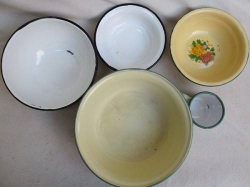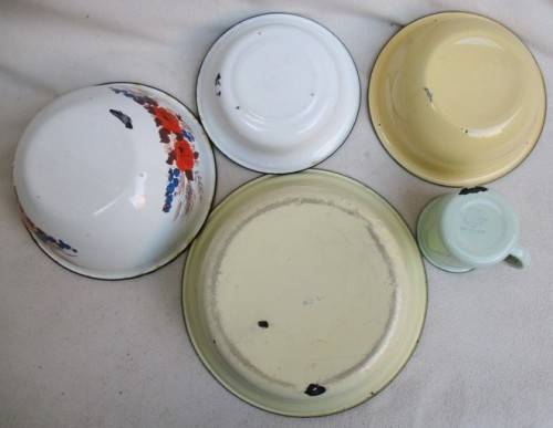 THERE ARE FOUR DISHES AND A SMALL MUG - ALL IN GOOD CONDITION WITH THE ODD ENAMEL CHIP REFER IMAGES FOR MEASUREMENTS