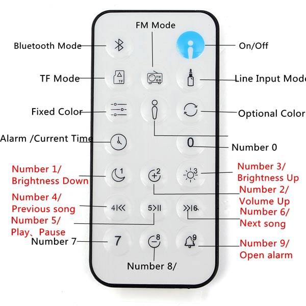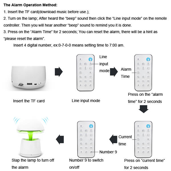 2. The alarm clock: alarm clock music from the TF card (not included),If remove the TF card, alarm clock will stop work.