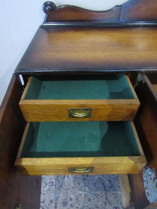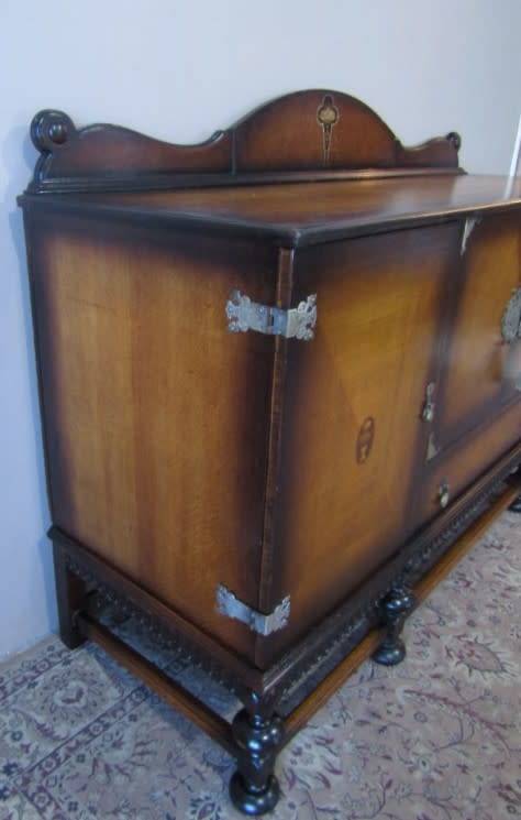 This spectacular, rather larger than normal Victorian styled side server cabinet with marquetry inlay is a beautifully appointed cabinet and has been well looked after. The cabinet most likely dates to the early 20th century and is a very well made antique piece. The buffet cabinet measures 185cm long x 60cm wide x 120cm high. There is a key for the cabinet. The doors and drawer have beautiful metal period style handles. There is a drawer to stand wine bottles, drawers for cutlery and a shelved cupboard. The buffet cabinet has minor age and usage related wear and tear and scuffs as with all antique pieces. Please view the pics carefully to fully appreciate this stunning buffet cabinet and to confirm the condition. Please view the shipping options or request courier costs prior to purchasing any of our products.
