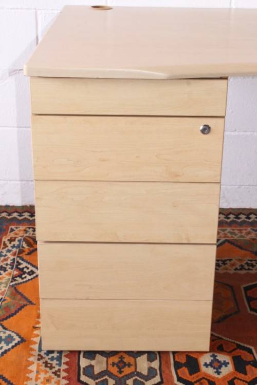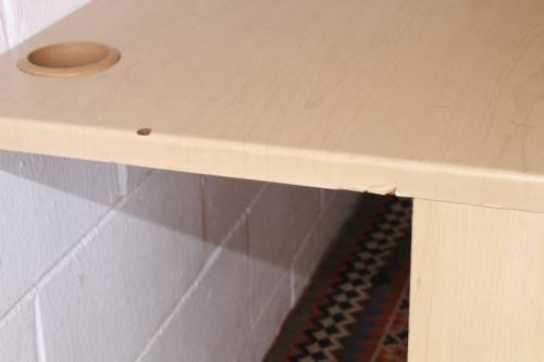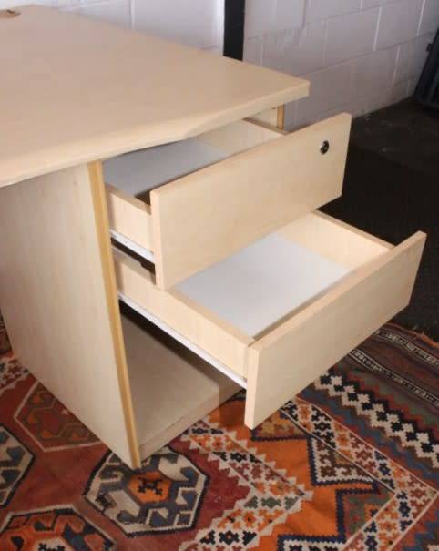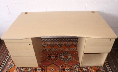 This larger 7-drawer cedar-colour veneer wrap desk with cable holes and a stationary top-drawer tray is in good condition and has a some usage related wear and tear associated with a second hand desk. The desk measures 160cm long x 90cm wide x 72.5cm high and has two cable holes on the top. The desk is ideal for a home office or study or for a desk at work. The left hand pedestal has four drawers plus a stationary drawer and the right hand pedestal has two drawers with space for a laptop or handbag etc. There are no keys for the drawers. Please view the pics carefully to fully appreciate this office desk and to confirm the condition. Please view the shipping options or request courier costs prior to purchasing any of our products.