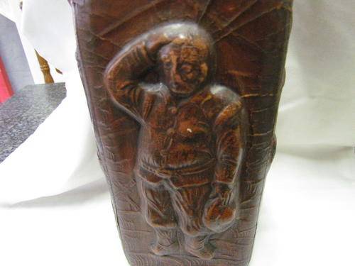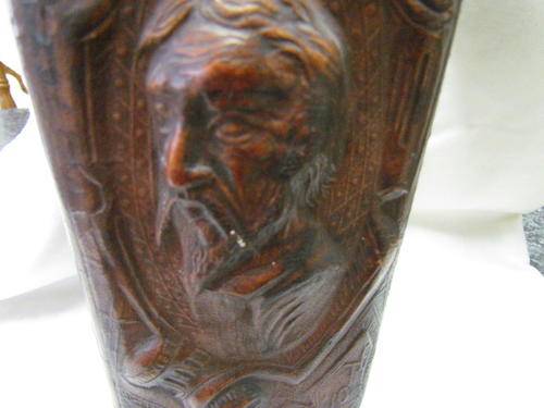 The embossed leather scene is depicting Don Quijote on the one side and Sancho on the other side. The top has a drop chain attached hanging from the decanter .