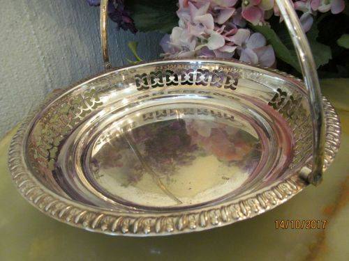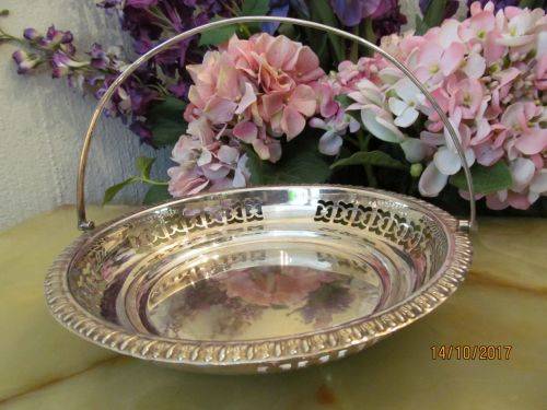 AN ITEM WHICH PROUDLY PROCLAIMS THE RETICULATED PIERCED METAL CHAIN LINK PATTERN ALONG ITS SIDES AS UNIQUELY AS IT DOES THE REPOUSSE CRAFT RIBBED MOTIF ALONG ITS EXTENDED RIM, UNITING ELEMENTS OF SILVER PLATED DECORATION IN AN INTRINSICALLY SUPERB VINTAGE CIRCULAR DISPLAY / PRESENTATION DISH ALSO FITTED WITH A SEMI-CIRCULAR SWING HANDLE AND FOUR STURDY BALL FEET UPON WHICH THE ITEM RESTS