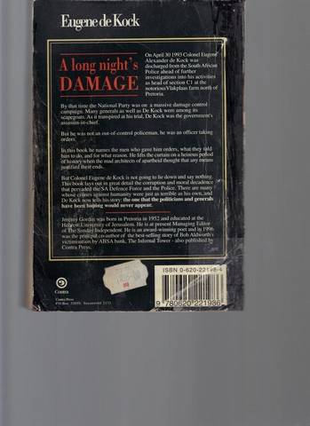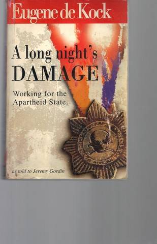 A long night's damage Working for the Apartheid State , By Eugene de Kock as told to Jeremy Gordon , Published by Contra 1998, first edition, soft cover, wear & tear on the cover and some liquid marks otherwise a good reading copy, 332 pages.
