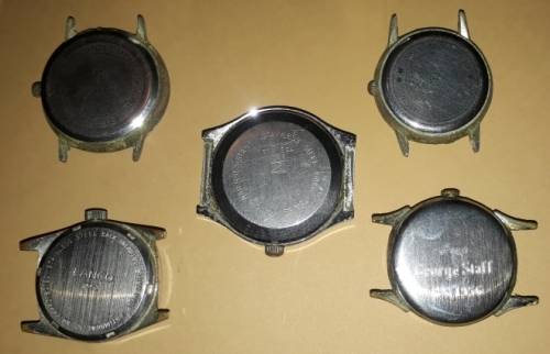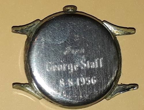 The name stamped on the pocket watch is Improved Lever. I was unable to open the pocket watch.The watch with the stamp NCS was a gift from the National Science Council, Republic of China to the previous owner.Only the Tissot watch has a personal inscription that says: From George Staff 6.8.1956 The stamps at the back of the other watches are all brand names or just an indication that the watches were made from Stainless Steel, etc.