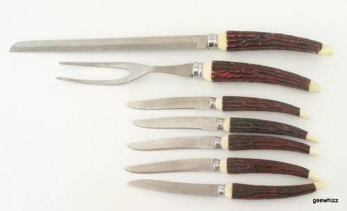 Large knife and fork with 5 matching small knives. The handles are imitation horn