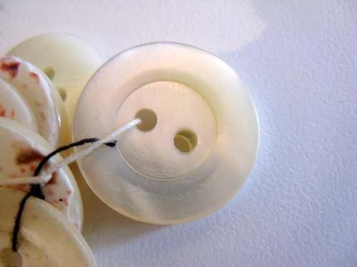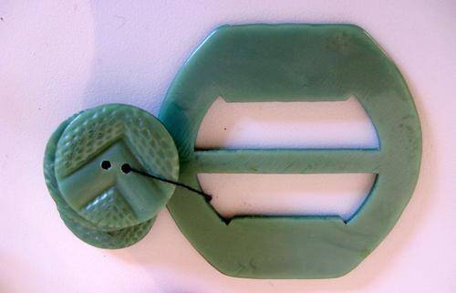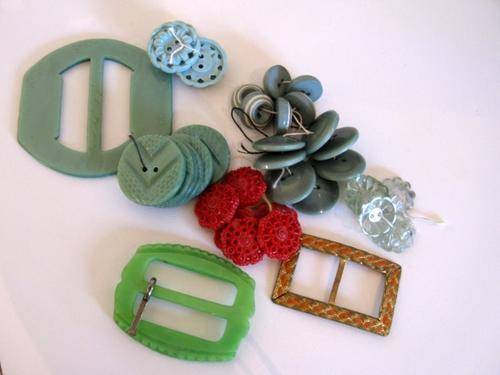 40's and 50's plastic buttons and mother of pearl. A green plastic buckle and a metal buckle