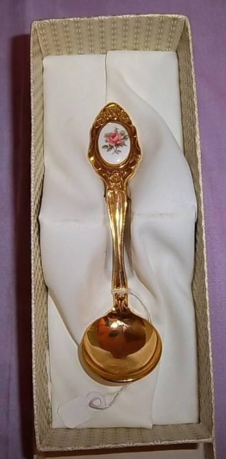 A LOVELY BOXED 24CARAT GOLD PLATED EETRITE SUGAR SPOON. PINK ROSE MOTIVE ON PORCELAIN PIECE. VERY GOOD CONDITION, ALMOST AS NEW.