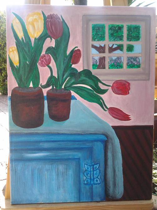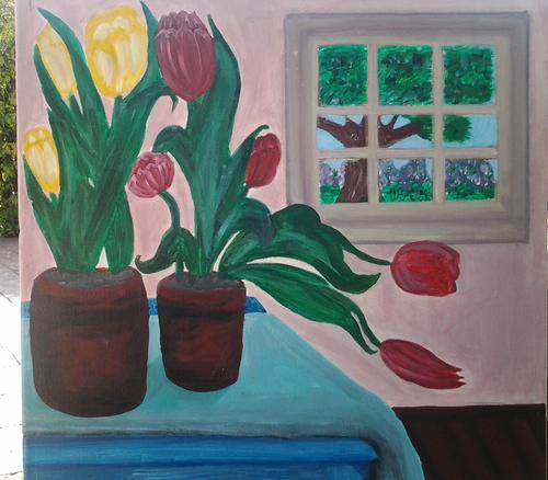 A very different painting with a window showing a tree and beautiful garden on the outside with two potplants standing on a cupboard.