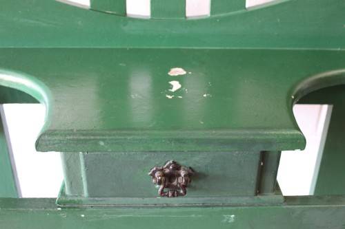 This stunning tall vintage green painted hall stand with a large round beveled centre mirror is in good vintage condition and a beautifully made taller hall stand. The hall stand measures a very decent 93cm long x 37cm wide x 206cm high. The hall stand has six hooks for hats and jackets and has a small surface area under the mirror. The hall stand has a single storage drawer and spaces for umbrellas/ canes, walking sticks etc. This hall stand would look lovely in a foyer or entrance hall and is a very practical piece of furniture. The green paint finish makes this an unusual stand that is a definite eye-catcher. There is some age and usage related wear on this stand and some of the paint is chipped but as a vintage and unusual piece this looks good overall and it is very sturdy. This would also be a great project to re-paint/ touch up. Please view the pics carefully to fully appreciate this wonderful tall hall stand and to confirm the condition.