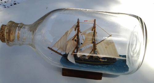 A lovely Handcrafted Vintagey sail ship in a glass bottle complete with the cork stopper.