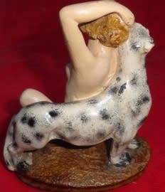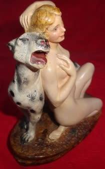 Stands 17cm in height on base (16cm in length).The lady is cushioned by a leopard. Inscribed on the base " venere con leo padro". No damage. Reasonable offers accepted.