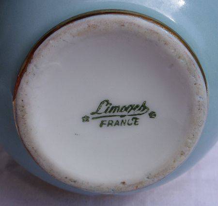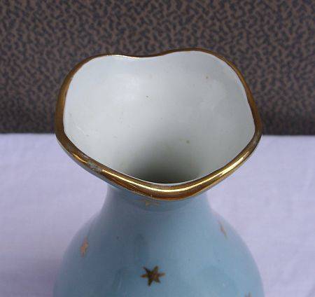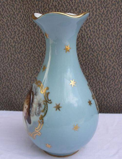 A gorgeous French vase in baby blue depicting two Victorian ladies and stars . The vase is made by Limoges , a pricey luxury porcelain firm . The only "fault" is due to normal wear and tear , slight fading of the gold rim around the opening . This can be corrected easily with a gold coki . There are no chips or cracks .